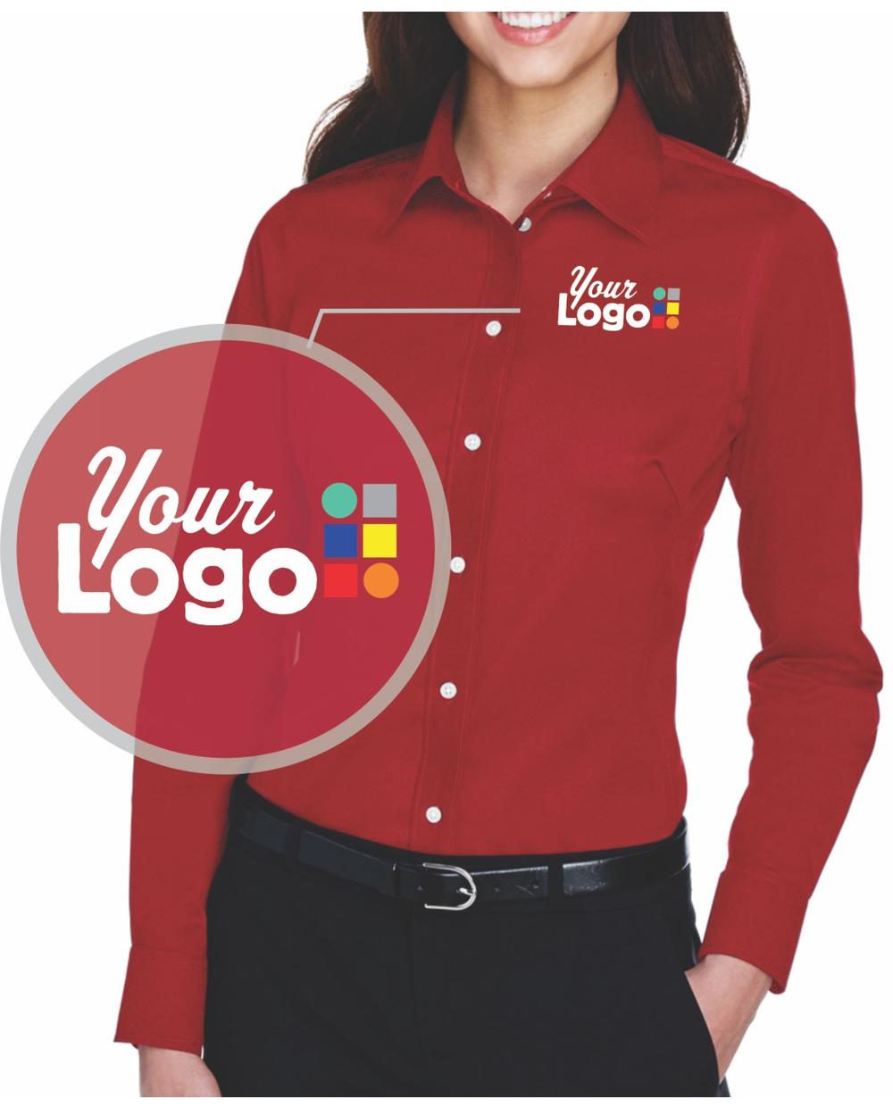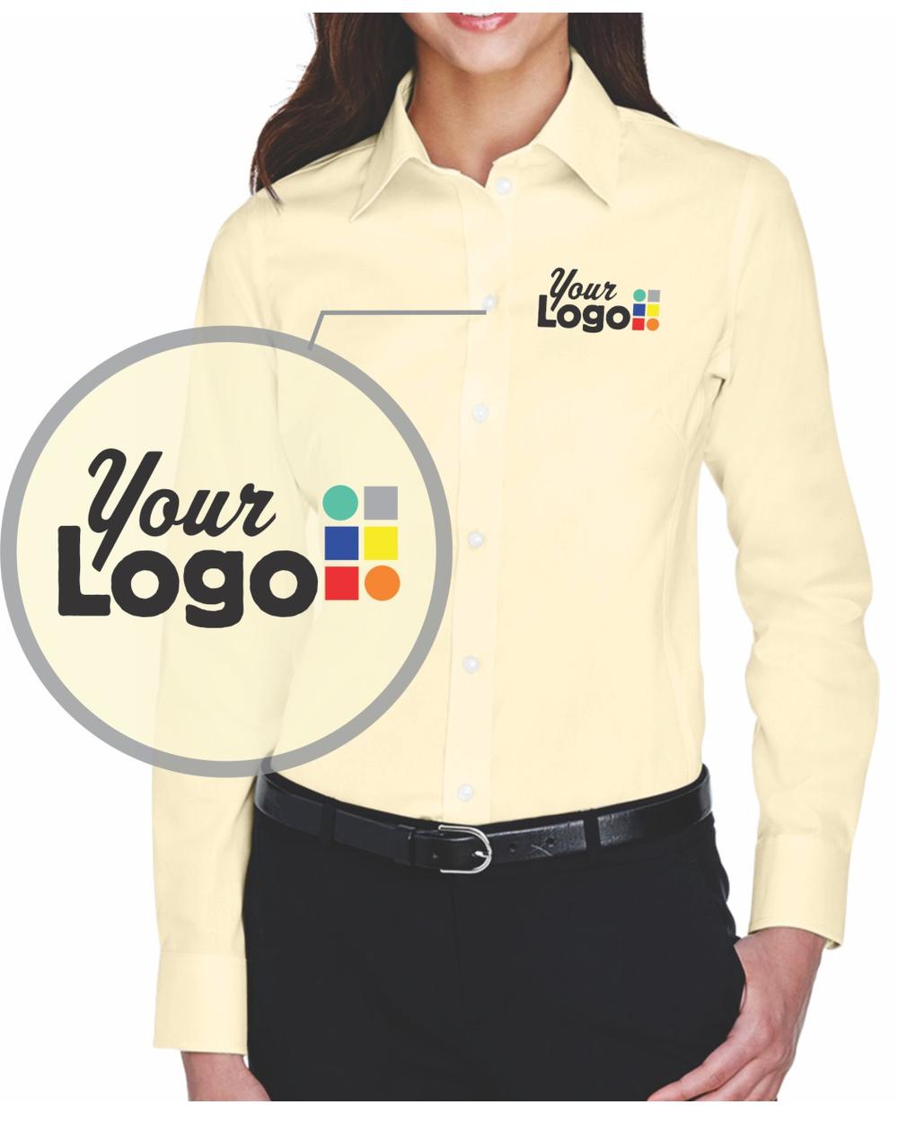 - 3.5 oz., 53% cotton, 43% polyester, 4% lycra; Fine yarn count shirting; True Non-iron performance straight from the dryer; stain release finish; Features: Active Fit; Patented pucker-free taped seams; Fused collar, cuffs, and placket; Split back seam with bias cut back yoke; straight collar; pearlized buttons; front and back princess seams for a flattering feminine fit; bust darts for a flattering feminine fit; comes with your logo to be embroidered on left chest, NO stup charge, turnaround time: 6-8 days; 6 minimum