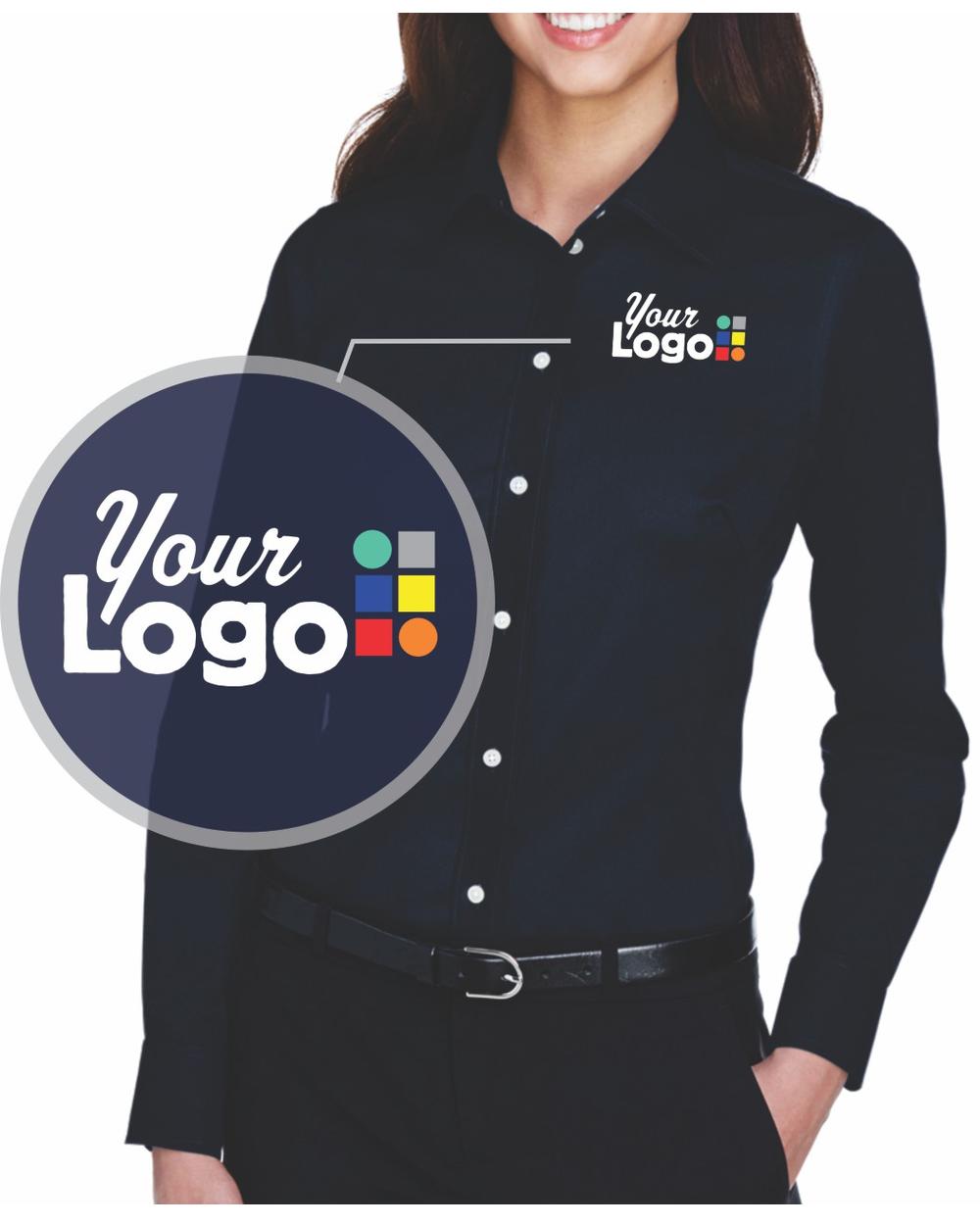 - 3.5 oz., 53% cotton, 43% polyester, 4% lycra; Fine yarn count shirting; True Non-iron performance straight from the dryer; stain release finish; Features: Active Fit; Patented pucker-free taped seams; Fused collar, cuffs, and placket; Split back seam with bias cut back yoke; straight collar; pearlized buttons; front and back princess seams for a flattering feminine fit; bust darts for a flattering feminine fit; comes with your logo to be embroidered on left chest, NO stup charge, turnaround time: 6-8 days; 6 minimum