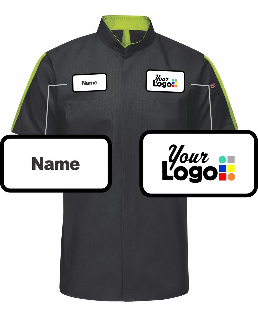 - Comes with a Custom Logo on left chest and a Personal Name on right chest, the application can be direct Embroidery or Embroidery on Patches (customers choice), 6 Minimum, No Setup, 8-12 Days Turnaround Time.