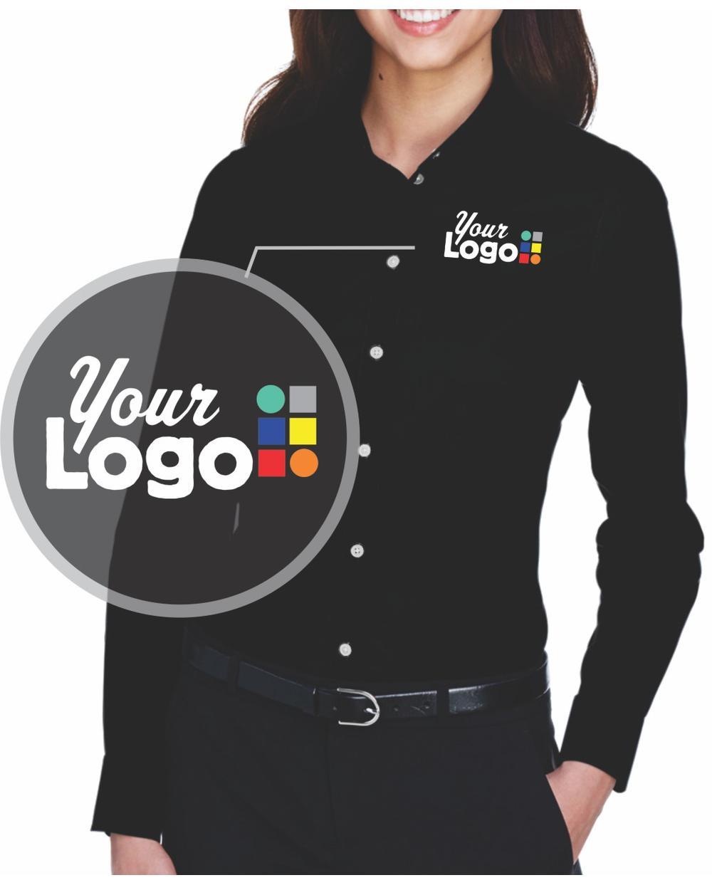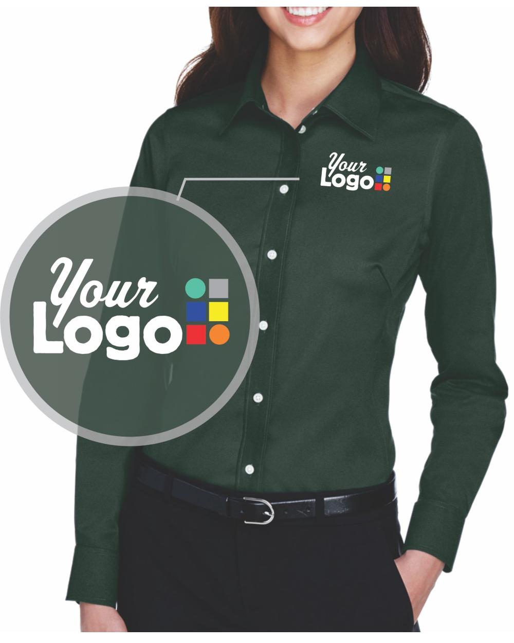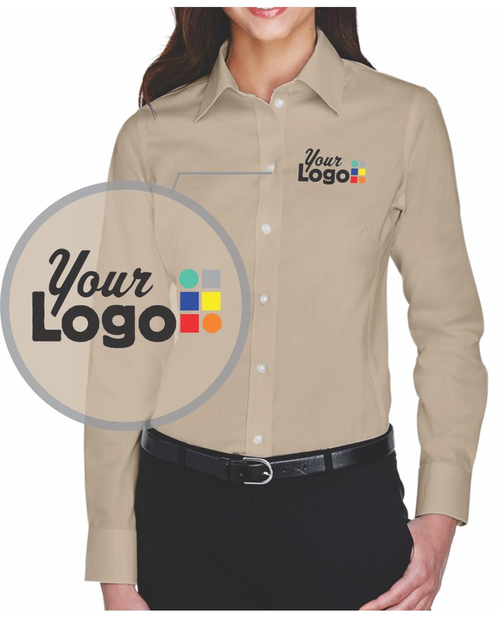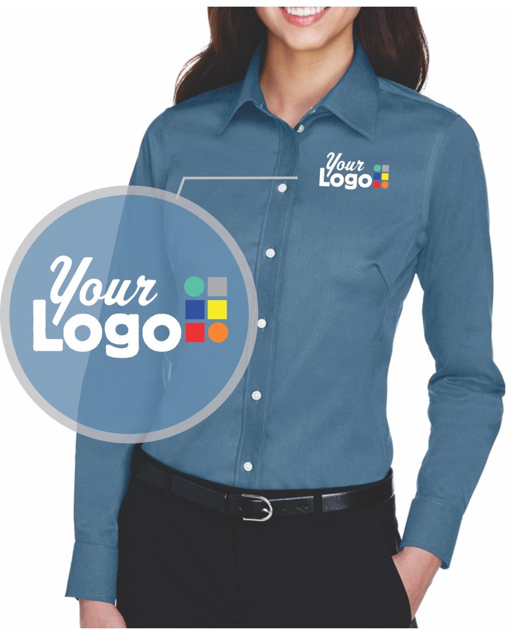 - 3.5 oz., 53% cotton, 43% polyester, 4% lycra; Fine yarn count shirting; True Non-iron performance straight from the dryer; stain release finish; Features: Active Fit; Patented pucker-free taped seams; Fused collar, cuffs, and placket; Split back seam with bias cut back yoke; straight collar; pearlized buttons; front and back princess seams for a flattering feminine fit; bust darts for a flattering feminine fit; comes with your logo to be embroidered on left chest, NO stup charge, turnaround time: 6-8 days; 6 minimum