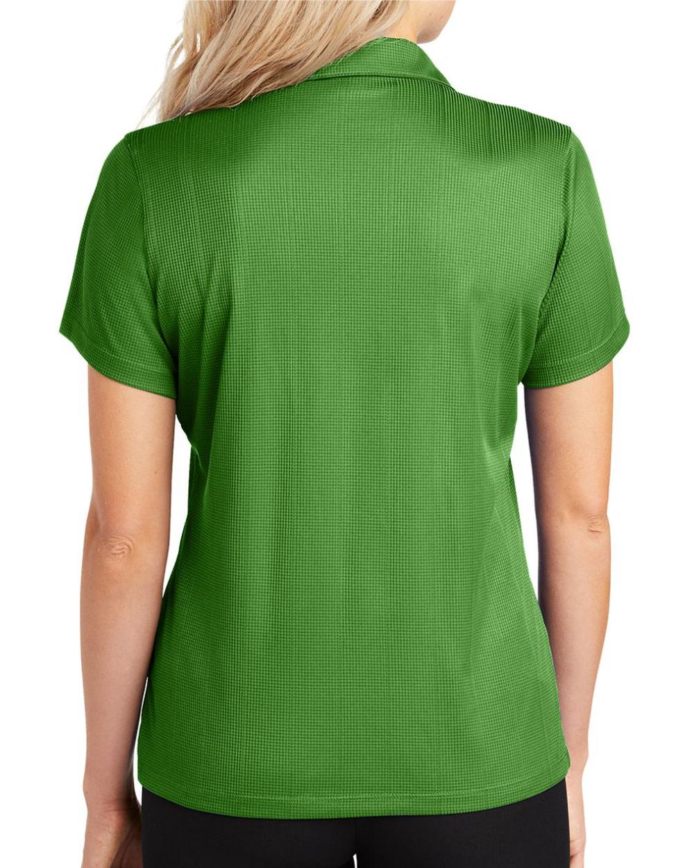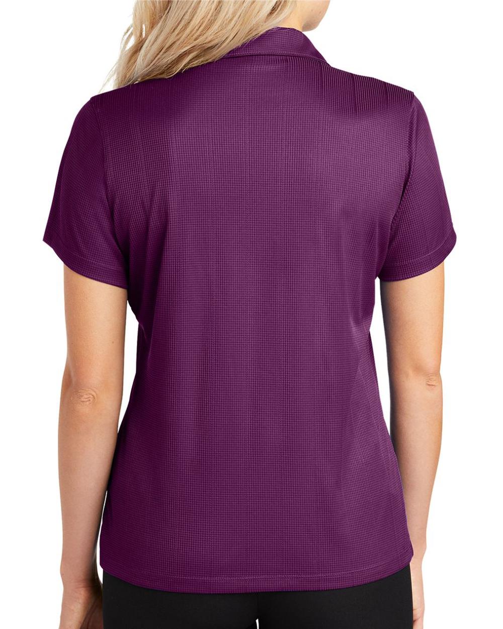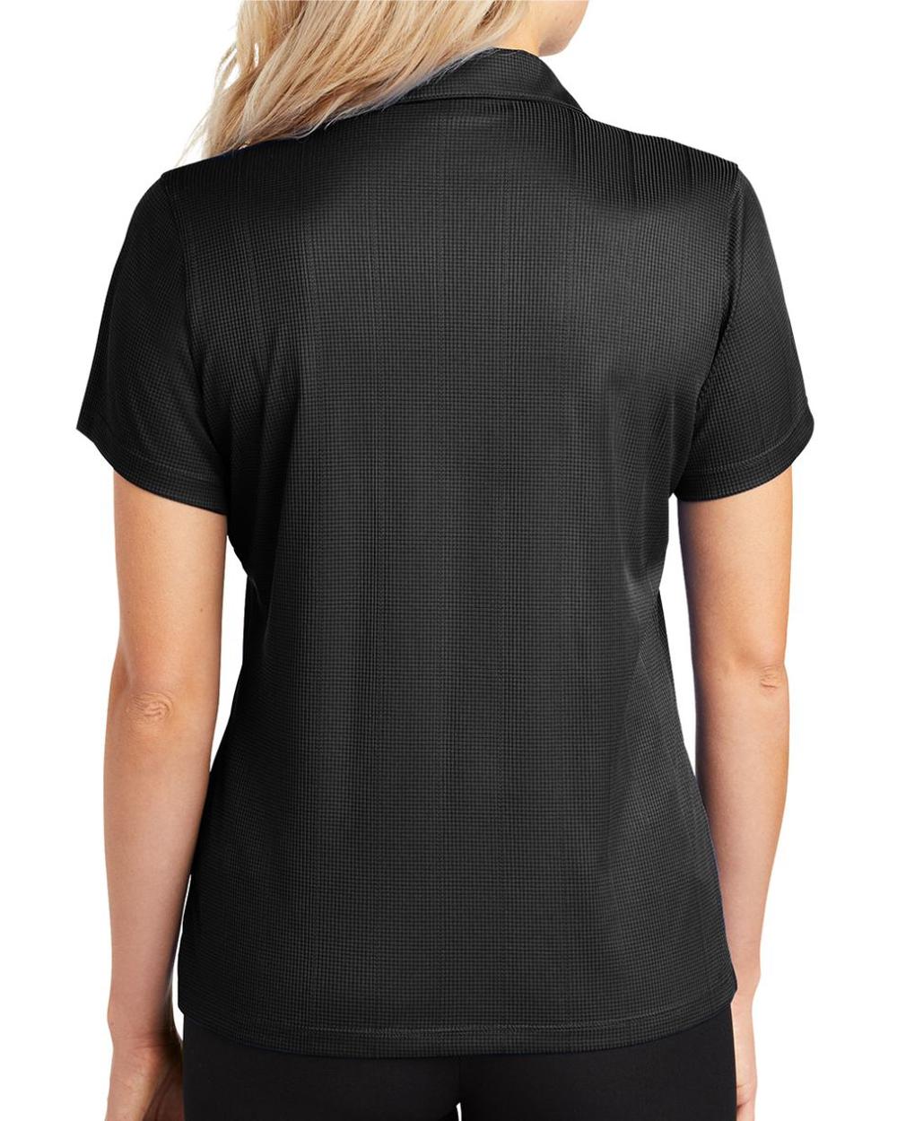 Lightweight and breathable, this moisture-wicking shirt has a pleasing drape, subtle jacquard texture and an open placket for feminine style.