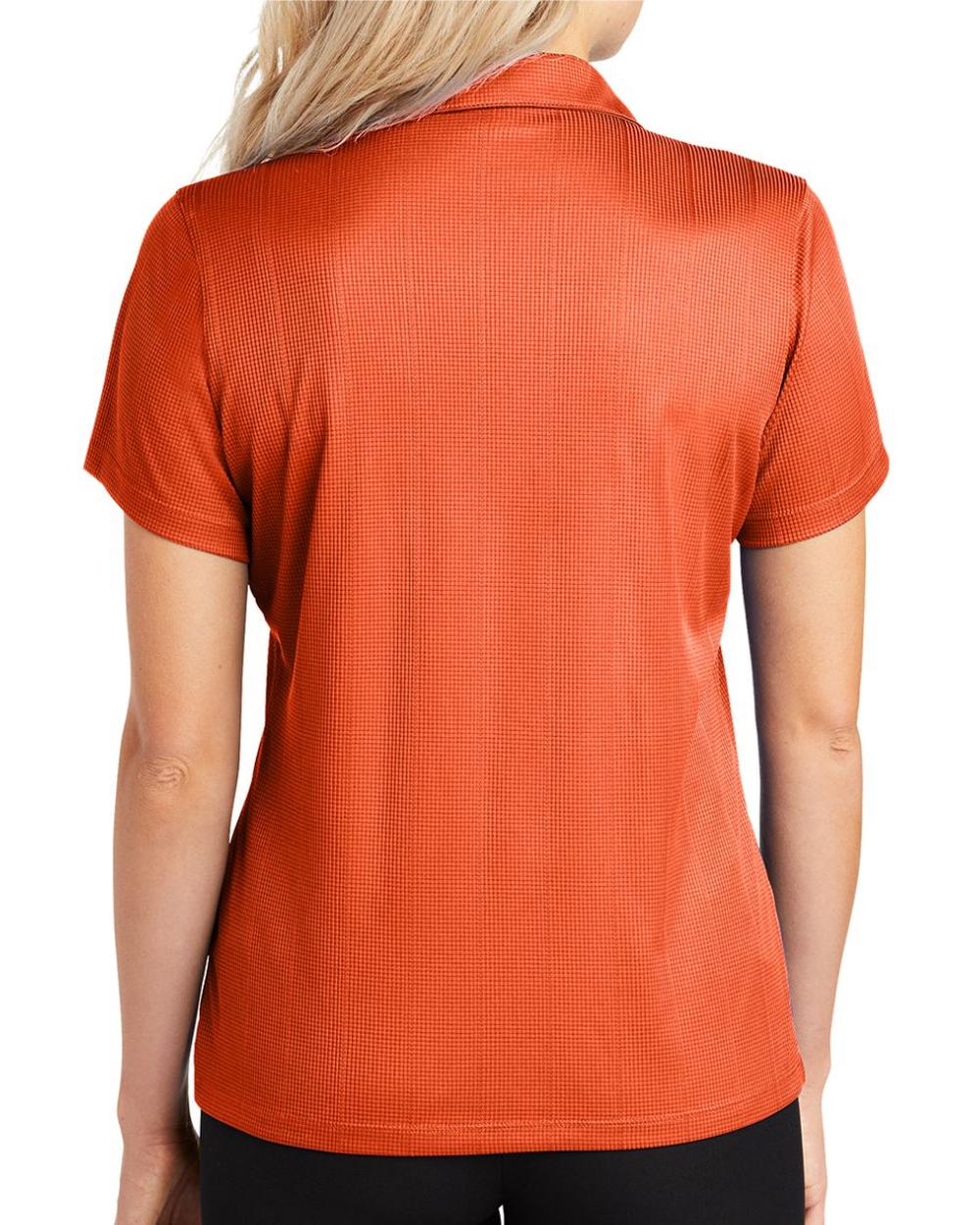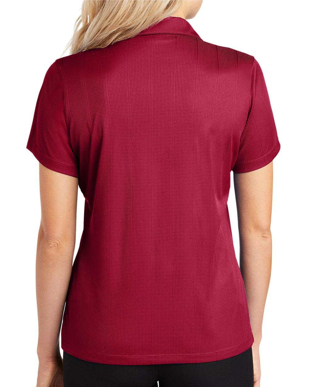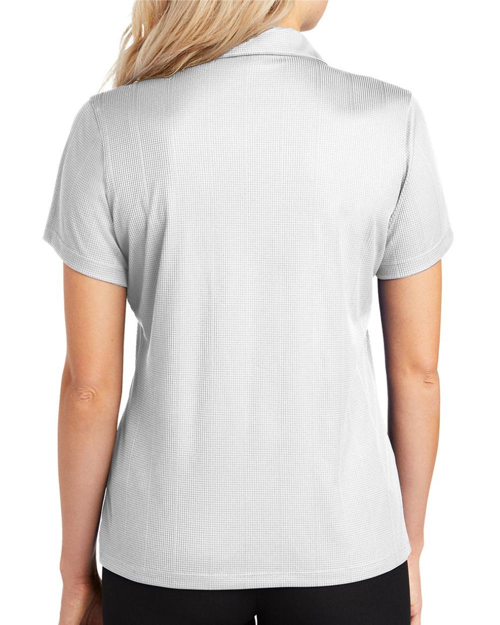 Lightweight and breathable, this moisture-wicking shirt has a pleasing drape, subtle jacquard texture and an open placket for feminine style.