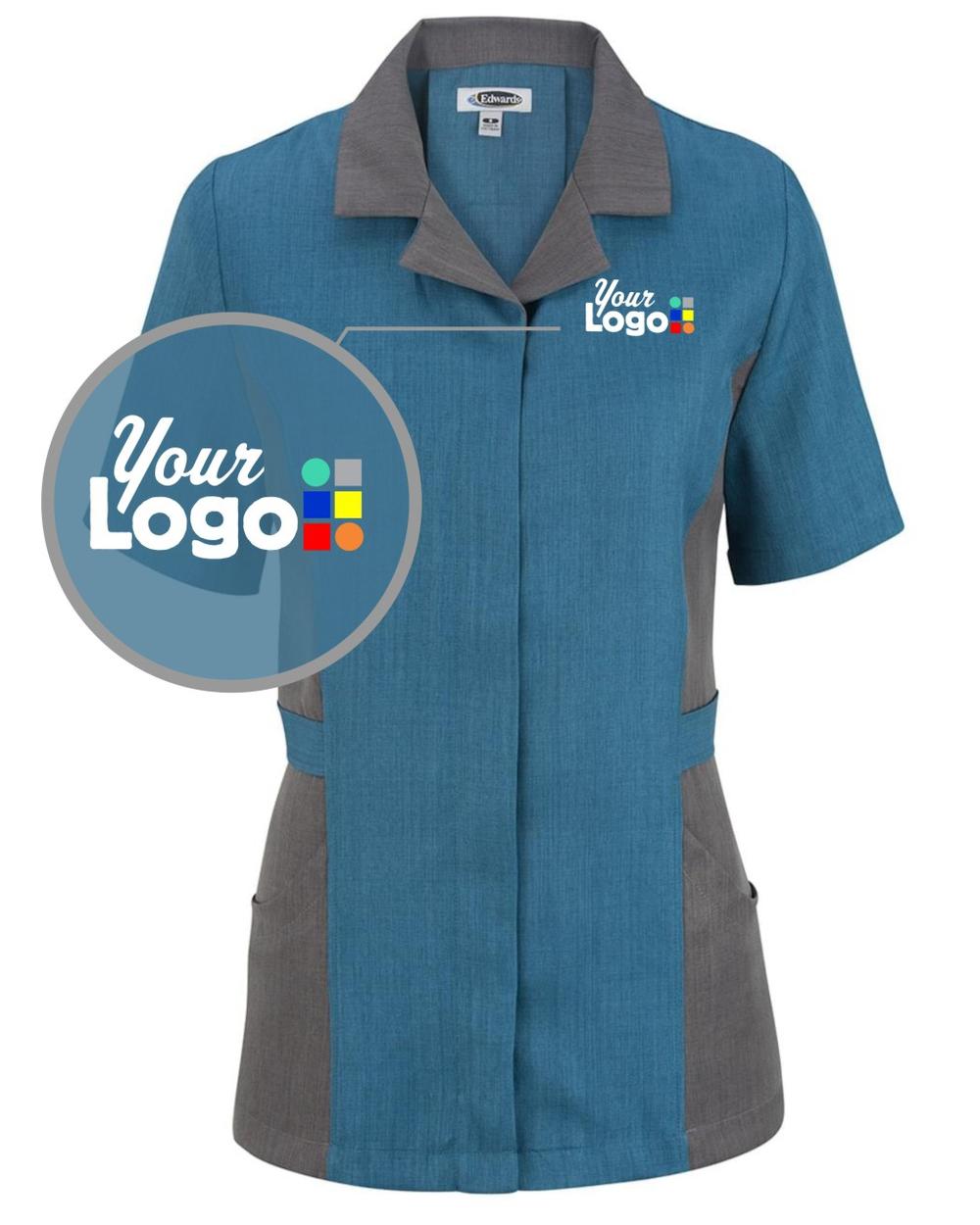 - This Ladies' Housekeeping tunic offers contemporary styling in a variety of colors. The performance twill has a soft hand and is comfortable to wear. Scotchgard™ finish for easy stain release. Embroiders well. 100% Polyester; 4.0/4.25 oz. wt. Premier Tunic has hidden placket has soft hand and supple drape; Contrasting collar and side panel; Two deep hip pockets and accent belt; Tradditional fit, Scotchgard™ finish; Front/back princess seams for shape; Snap top button and reverse front zipper ensures a tidy appearance; Crisp; clean; cling free style with low pil fabric; Shrink; wrinkle and fade resistant; Soil release and moisture wicking Tested for 50 wash/dry cycles. Industrial launder or machine washable; comes with logo to be embroidered on left chest; not setup charge; 6 minimum; 5-7 days turnaround time.